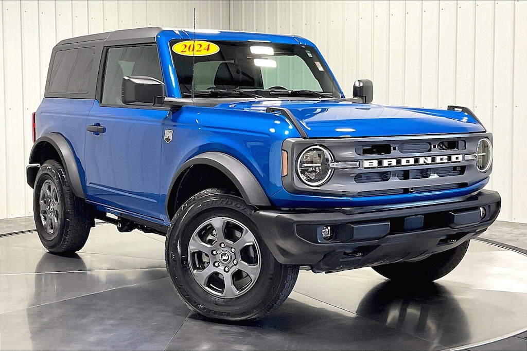 ***Navigation***Backup Camera***Heated Seats***Keyless Start***Bluetooth Connection***MP3 Player***Accident Free***One Owner -- Born for adventure, our 2024 Ford Bronco Big Bend 2 Door 4X4 with the Mid 222A/Trailer Tow Packages sets a bold benchmark for capability in Velocity Blue Metallic! Powered by a TurboCharged 2.3 Liter EcoBoost 4 Cylinder serving up 300hp to a 10 Speed Automatic transmission enhanced by multimode terrain management. Sure-footed traction is standard with a HOSS 1.0 suspension system, and this Four Wheel Drive SUV returns nearly 21mpg on the highway. Unconstrained by convention, our Bronco boasts LED lighting, fog lamps, a swing-out tailgate, heated power mirrors, front/rear tow hooks, alloy wheels, and a fully removable hard top and doors.