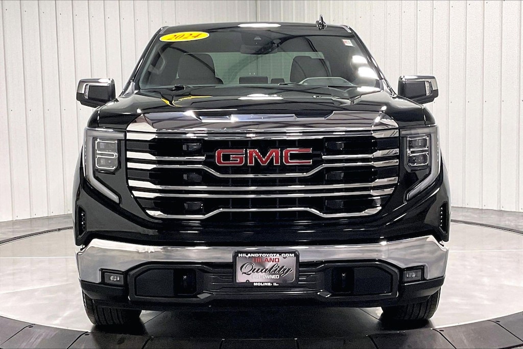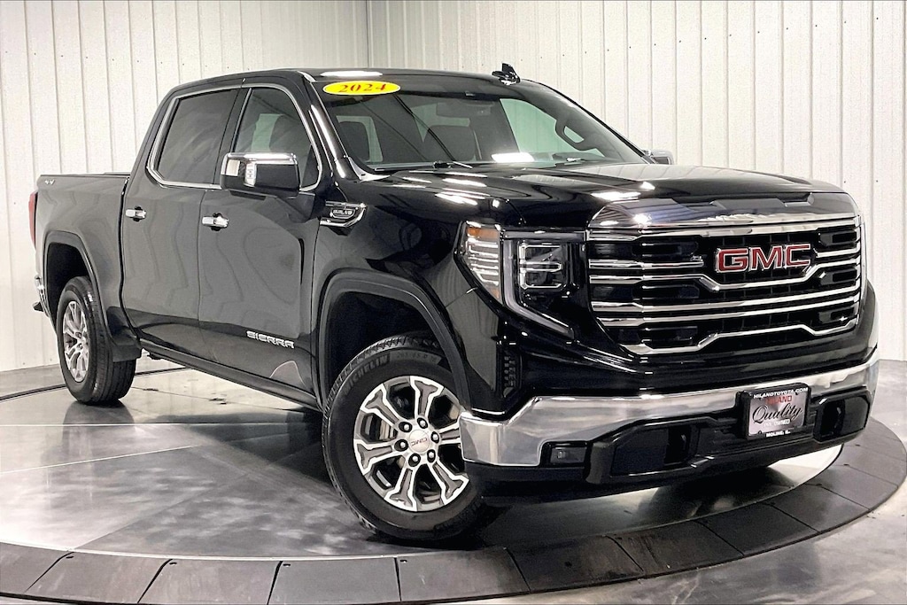 ***Backup Camera***Heated Seats***Heated Steering Wheel***Keyless Start***Bluetooth Connection***MP3 Player***Accident Free***One Owner -- Strong and stylish, our 2024 GMC Sierra 1500 SLT Crew Cab 4X4 is built to break boundaries in Onyx Black! Motivated by a 5.3 Liter V8 supplying 355hp to a 10 Speed Automatic transmission complemented by a locking rear differential for dynamic performance. Our Four Wheel Drive truck relies on that setup for serious capability and scores nearly 20mpg on the highway. Proudly poised for action, our Sierra boasts LED lighting, fog lamps, 18-inch alloy wheels, a MultiPro tailgate, perimeter lighting, bed lighting, chrome bumpers, corner steps, and heated power-folding mirrors with chrome caps.