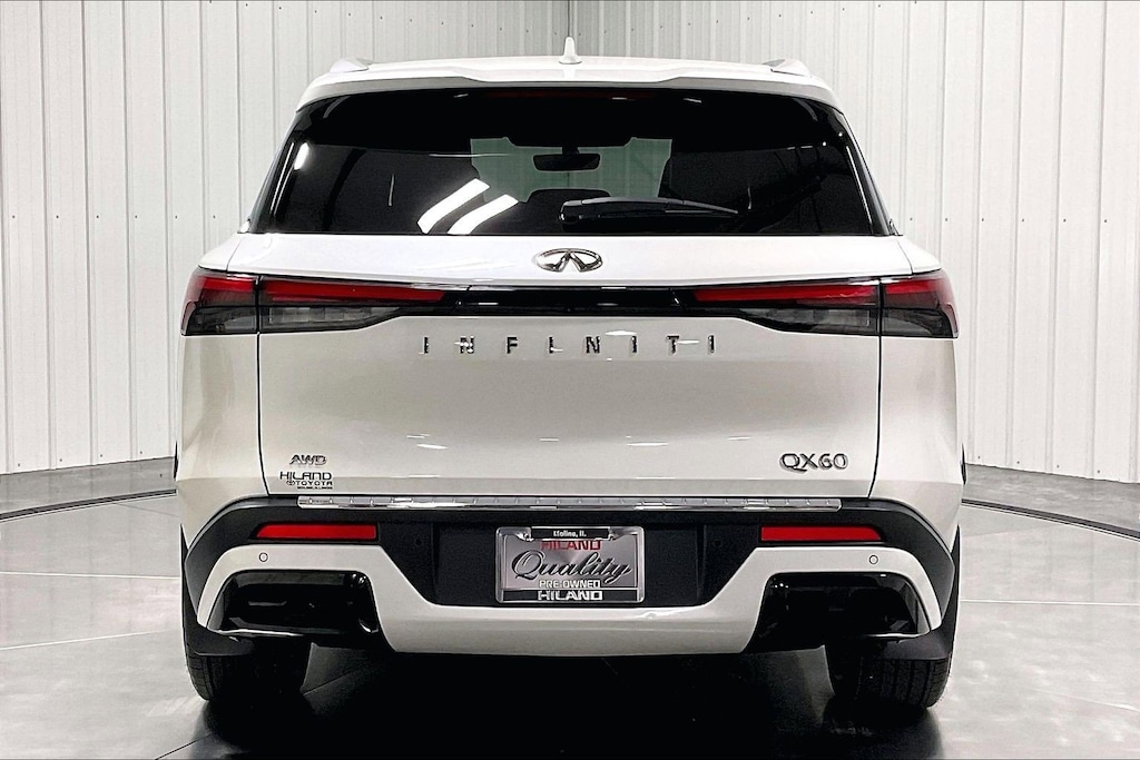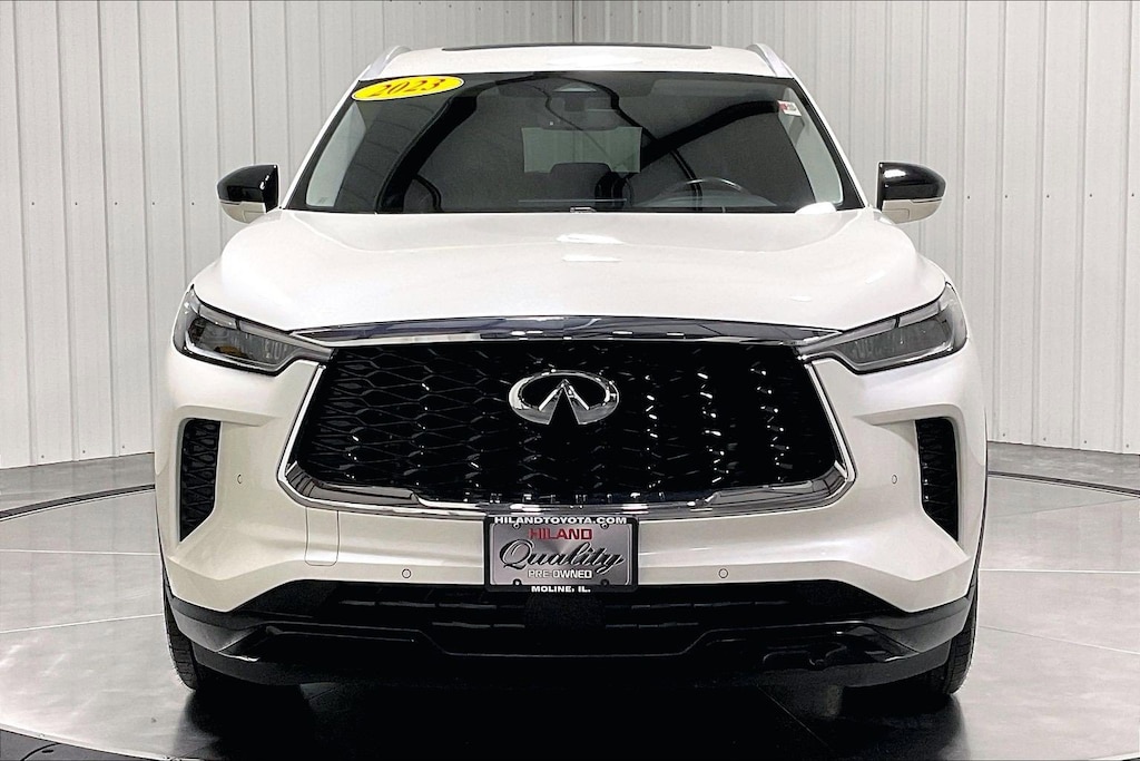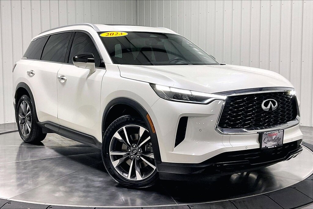 ***Navigation***Sunroof***Around View Camera***Leather***Heated Steering Wheel***Heated/Ventilated Front Seats***Bluetooth Connection***MP3 Player***Accident Free - Confident and commanding, our 2023 INFINITI QX60 LUXE AWD with Cargo Package in Majestic White is for drivers who live by their own rules! Motivated by a 3.5 Liter V6 that provides 295hp tethered to a paddle-shifted CVT for a terrific driving experience. Sport and Snow modes unlock upgraded capability, and this All Wheel Drive SUV sees nearly 25mpg on the highway. Our QX60 attracts attention as it goes by with strong lines, a panoramic sunroof, LED lighting, silver roof rails, gloss-black undercovers, a power liftgate, and 20-inch alloy wheels.