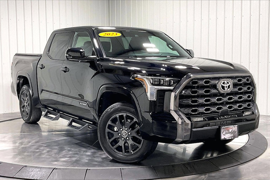 ***Navigation***Sunroof***Panoramic View Monitor***Leather***Heated Steering Wheel***Heated/Ventilated Front Seats***Bluetooth Connection***MP3 Player***One Owner - Our luxurious 2023 Toyota Tundra Platinum CrewMax 4X4 is loaded with bold benefits in Midnight Black Metallic! Motivated by a Twin-TurboCharged 3.4 Liter i-FORCE V6 serving up 389hp for a 10 Speed Automatic transmission engineered for excellence. This Four Wheel Drive truck is eager for action and moves with authority, plus it achieves nearly 22mpg on the highway. With a forceful presence, our Tundra features a panoramic sunroof, premium LED lighting, fog lamps, sequential turn signals, bed liner, tonneau cover, 20-inch alloy wheels, step bars, and daring gloss-black accents.